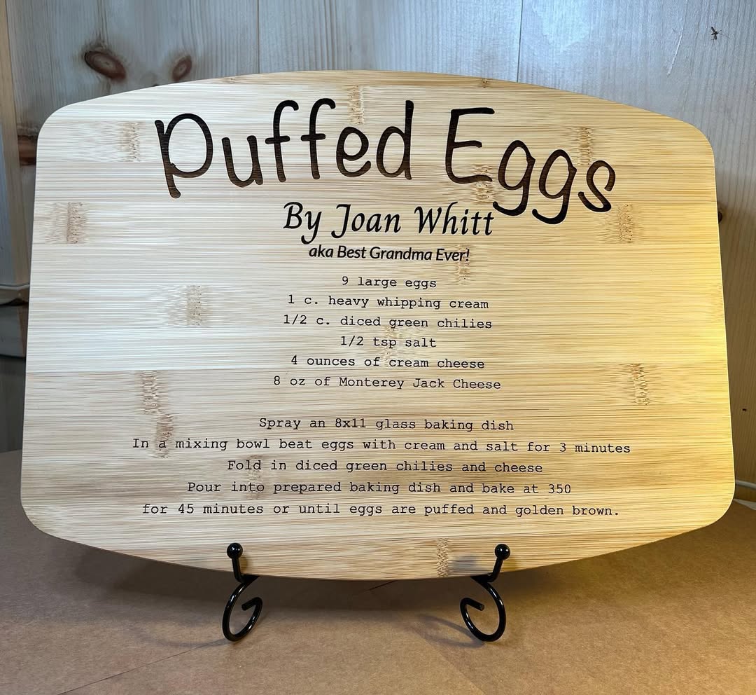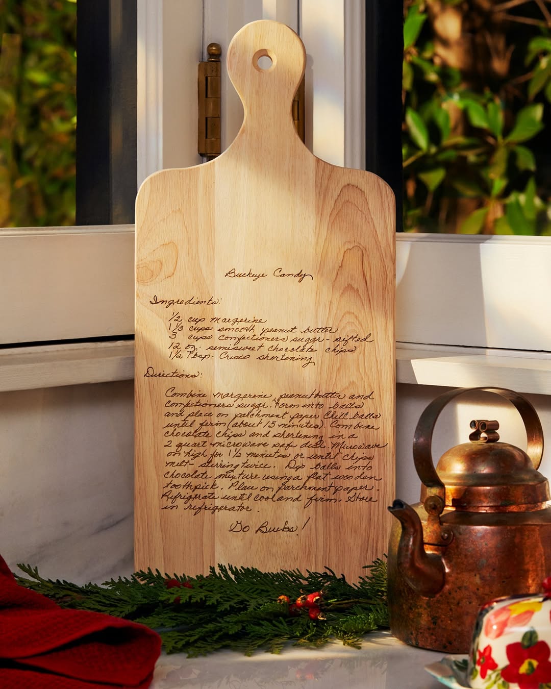 Cutting boards don’t get more sentimental than this. Here, a family recipe for Buckeye Candy is laser-engraved in handwritten script, turning a basic kitchen tool into a heartfelt heirloom. It’s decor, it’s utility, and it’s nostalgia all in one slab of maple. A top-seller during the holidays—especially when personalized with loved ones’ handwriting.