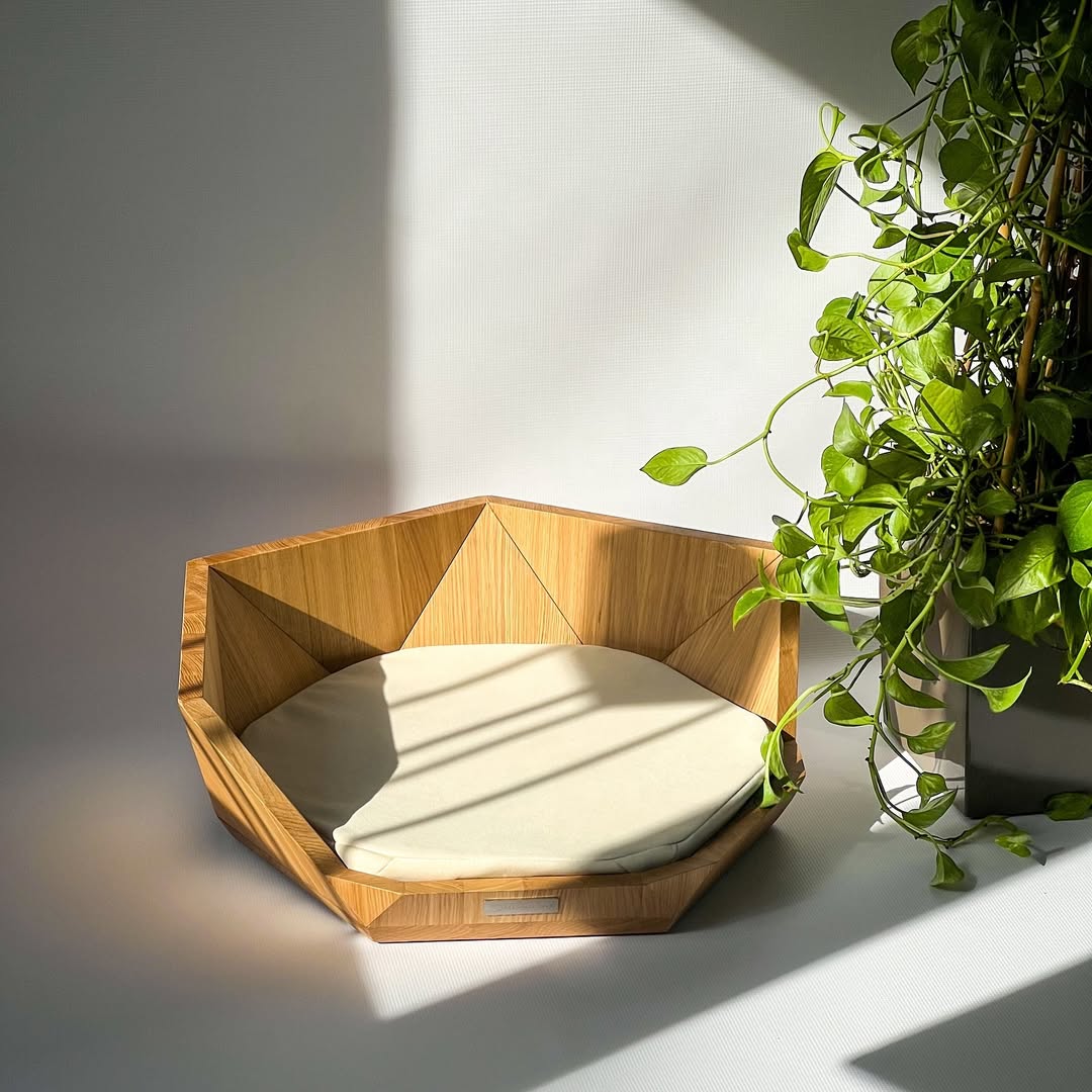 Geometric lines, rich wood tones, and a plush round cushion—this pet bed is basically modern furniture that happens to hold a furry friend. The faceted frame adds architectural flair while keeping things cozy and enclosed. Minimal enough for Scandi interiors, comfy enough for daily naps in the sun.