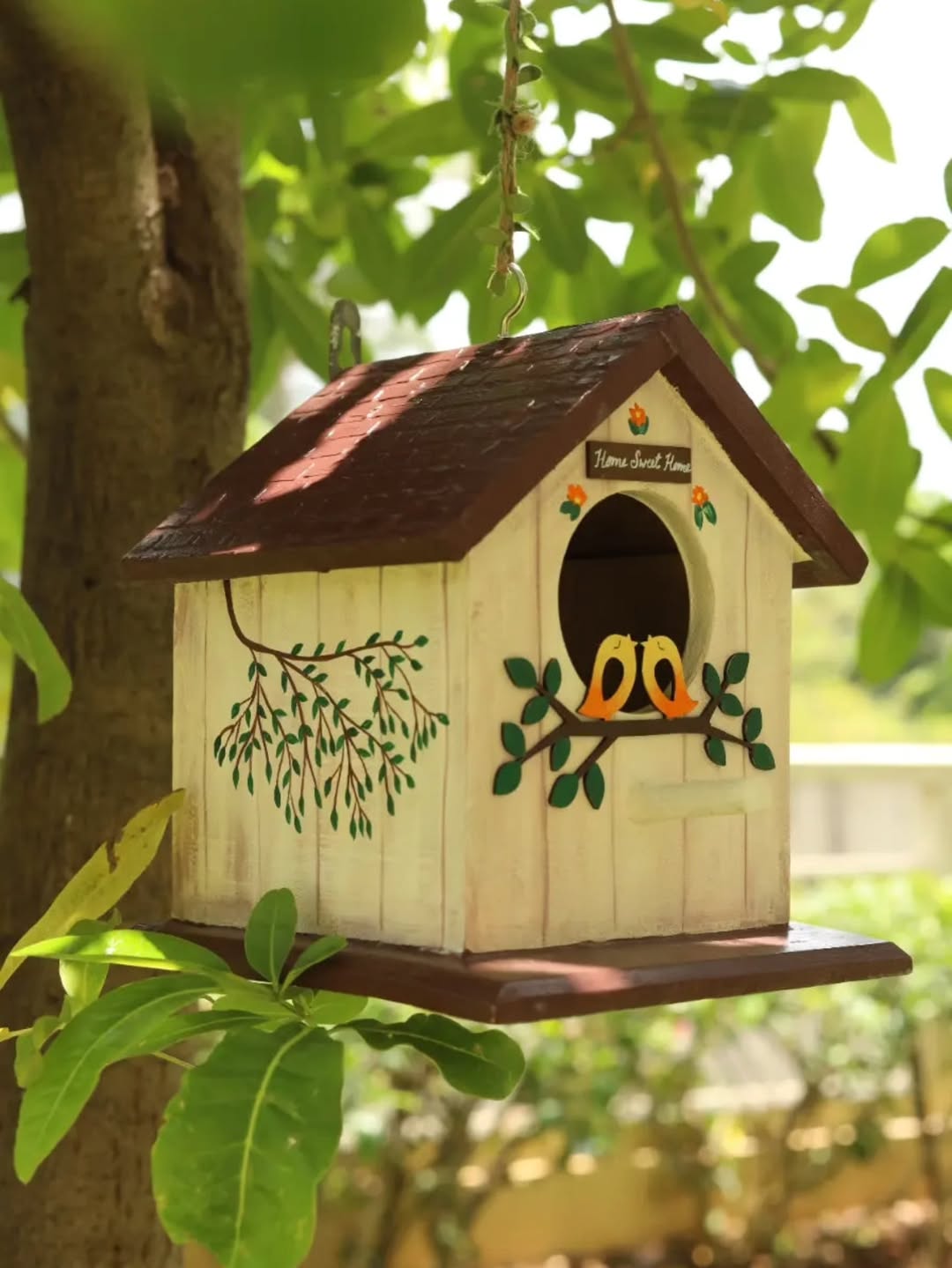 A hand-painted roof, leafy details, and two tiny lovebirds make this birdhouse feel like a rom-com set for sparrows. It’s charming, cozy, and full of personality—like a garden accent that actually earns its keep. Hung from a tree or porch beam, it turns any backyard into a mini wildlife welcome zone.