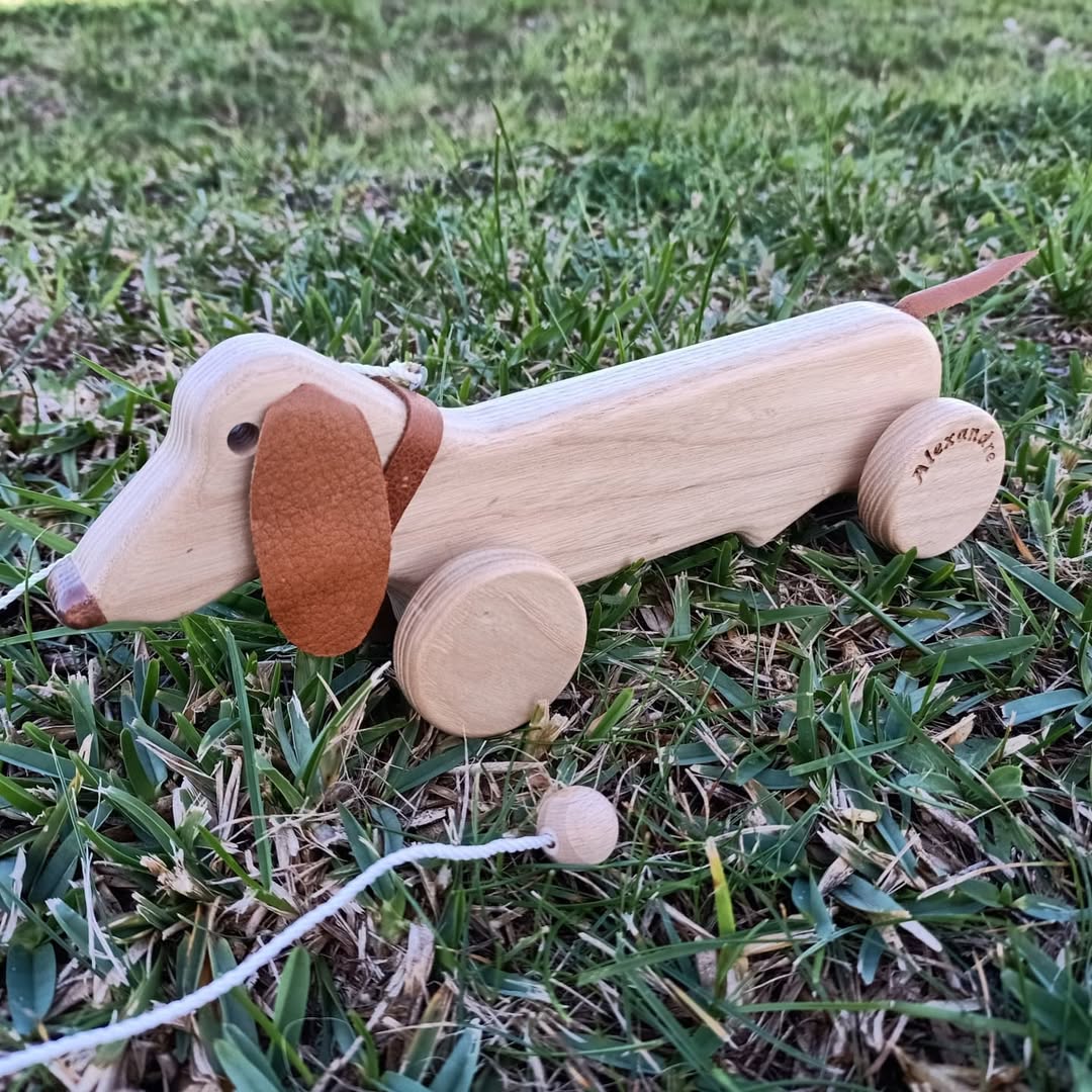 Soft edges, rolling wheels, and floppy leather ears make this wooden dachshund a total heart-stealer. Designed for little hands to pull along, it’s part toy, part toddler sidekick. Smooth, sanded wood keeps things safe and splinter-free—no batteries, no noise, just pure play. Bonus points for the name burned onto the wheel.