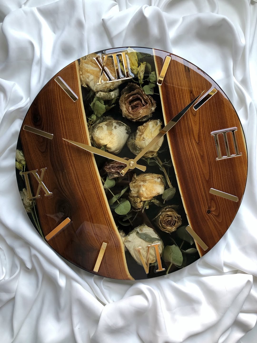 Preserved roses, glossy resin, and warm wood grain turn this wall clock into functional art. Metallic Roman numerals catch the light, adding a luxe touch without feeling fussy. Florals frozen in time make every glance feel poetic—because what’s more timeless than love and leaves?