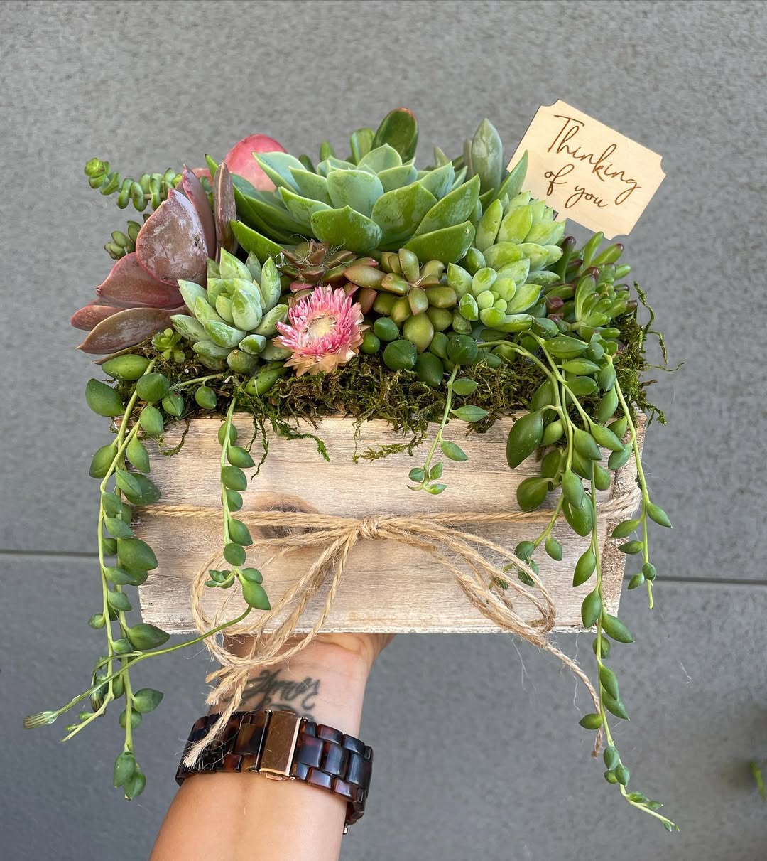 This rustic wooden planter box proves that good things really do come in small, leafy packages. A mix of plump succulents, moss, and a sweet handwritten tag gives it that just-right mix of charm and care. The twine bow seals the deal—gift-ready and zero watering anxiety. Perfect for windowsills, desks, or cheering someone up, no green thumb required.