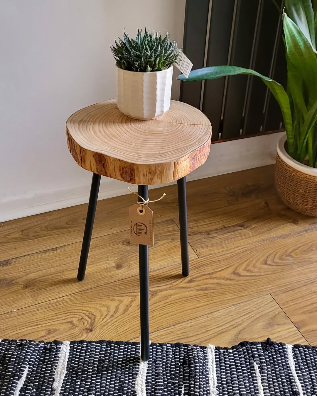 Raw wood meets modern minimalism in a piece that’s part nature, part statement. Every growth ring and bark edge on the tabletop feels intentional—because it is. Slim black legs keep the silhouette clean, letting the wood do all the talking. Perfect as a plant perch, coffee-side companion, or quiet little corner hero.