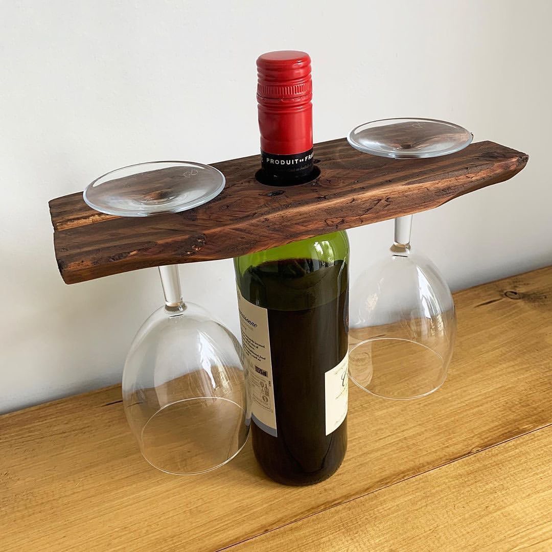 A single slab of rustic wood turns into a party trick with this clever wine caddy. Designed to sit atop any standard bottle, it snugly holds two stemmed glasses for instant presentation points. Natural edges and visible grain give it a handmade, one-of-a-kind feel—perfect for gifting or date night at home.